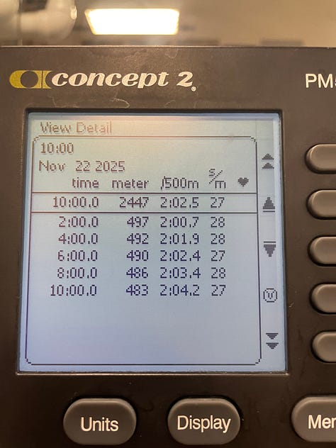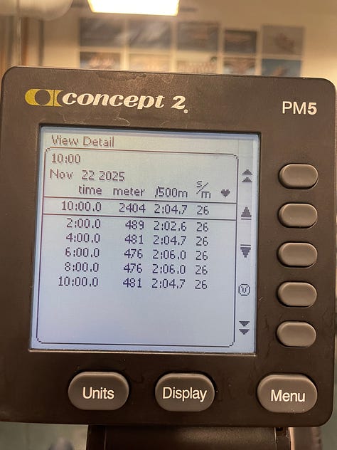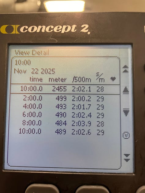 This month, rowing finally kicked into full gear, and winter training was pretty hard. There isn’t any scenery or races, just the erg and your numbers. Most workouts were long, steady pieces and early attempts at sharpening for the winter. It’s not glamorous, and honestly, some days were rough. I recently had my first 3 x 10’ and held an average of 2:03.1.